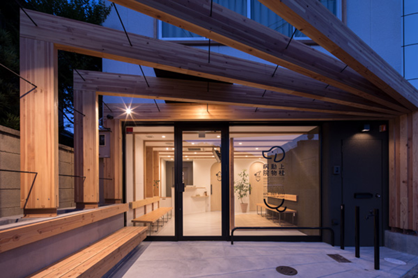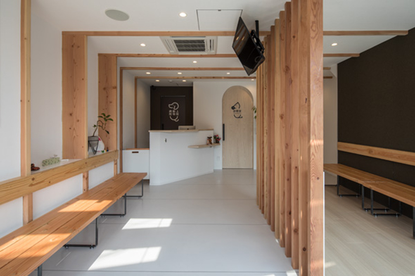 そこで、ビルの前にある三角形の空地に、道路側ほど高くなるように木製のフレームを放射状に並べた。このフレームは待合室にも連続しており 院内に誘導するような流れをつくり出すと同時に、特徴的な形状で動物病院の存在を周囲にアピールしている。