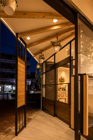 外部は窯業サイディングを小割りにしヨロイ張りとした外壁で全体を覆い、よく目立つ角地の部分をえぐり取るようにアプローチを設けている。