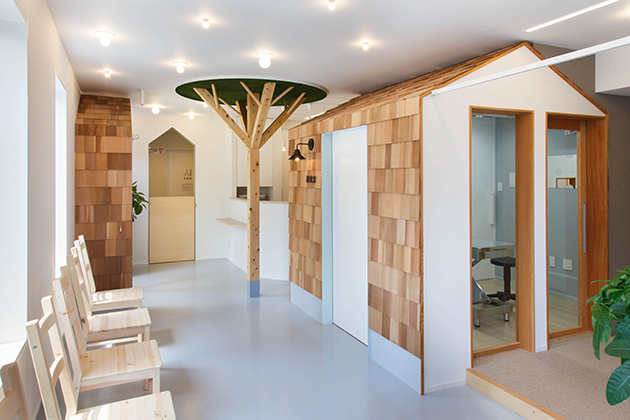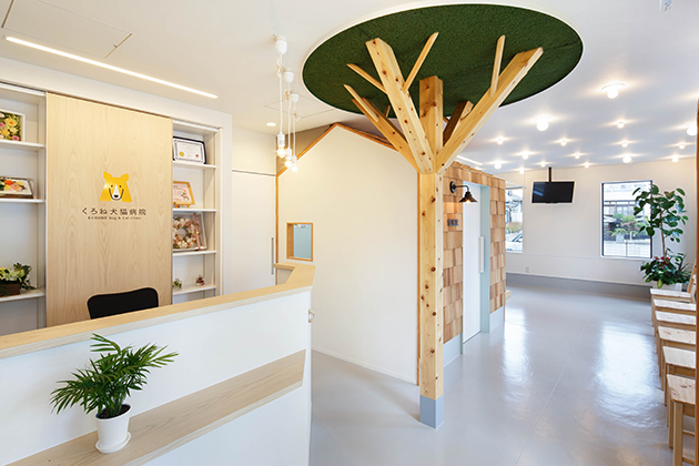 具体的には診察室を家に、待合室を家々に囲まれた広場のように表現し、くろね犬猫病院という小さな町が屋内にあるかのようなイメージをつくっ ている。