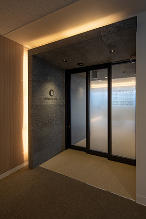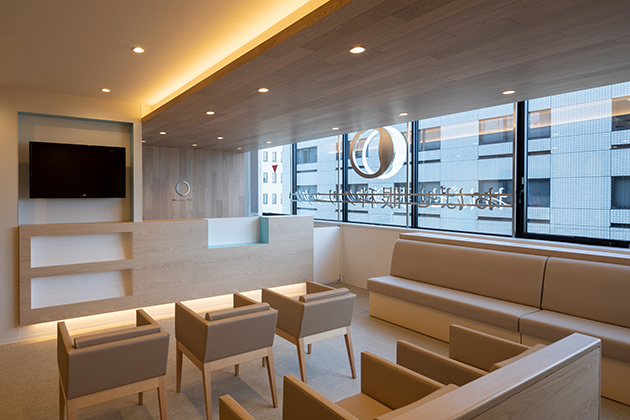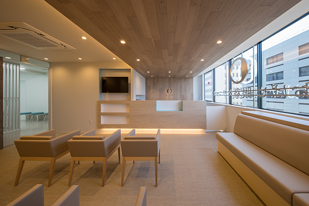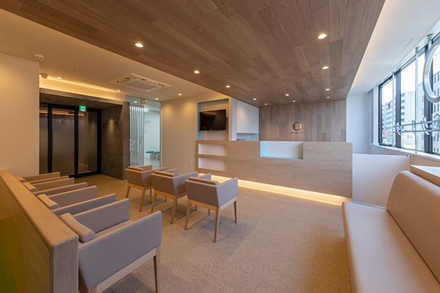 また同時に、最新機器による負担の少ない治療をおこなう高い技術力と安心感を感じてもらえるように、エントランスでは落ち着いた色調の素材を使っている。