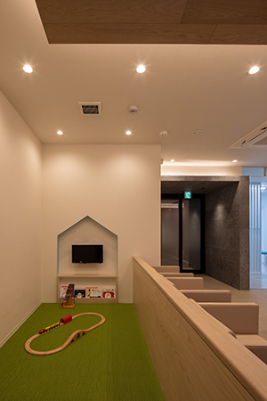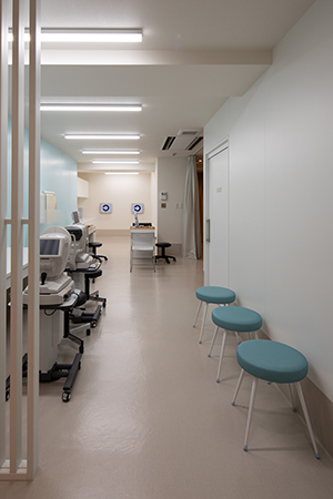 子供から高齢の方まで幅広い年齢層の患者様がこられるため、キッズスペースはもちろん、高齢者の方でも座りやすい椅子や、滑りづらく万が一転倒した場合でも安心な床材(織物調ビニルシート)を採用している。