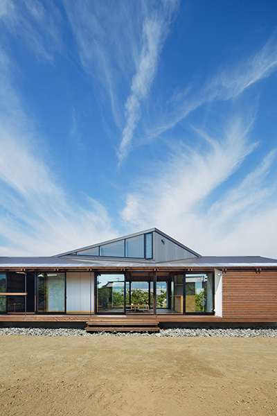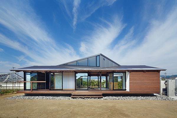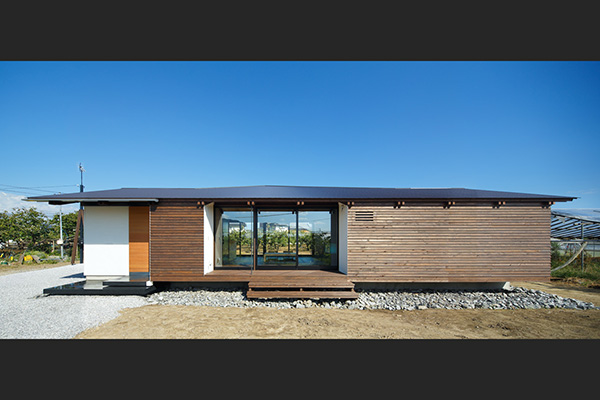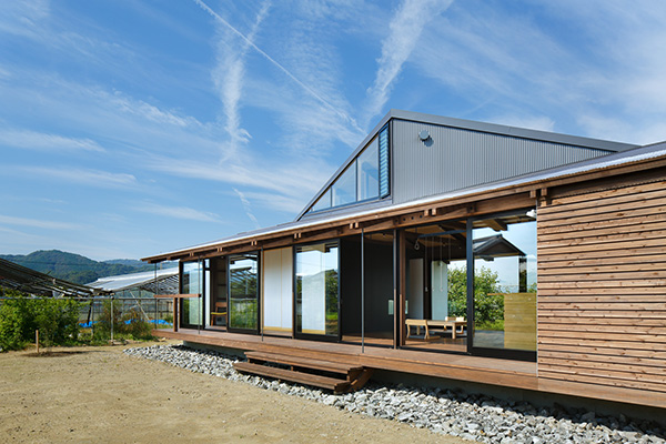 切妻型のビニルハウスや農機具小屋など周囲にあるモノの形態や素材を、クライアントの個別事由や住宅としての特性で変容させることにより、周囲に馴染むような住宅に出来ないかと考えた。