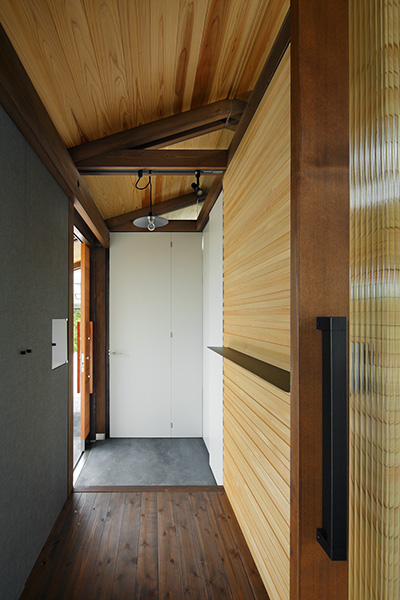 素材は周辺の農機具小屋などでも使用させる小波板(屋根)や、杉板下見板張り(外壁)とし、農地に建つ違和感をなるべく軽減するよう考慮している。