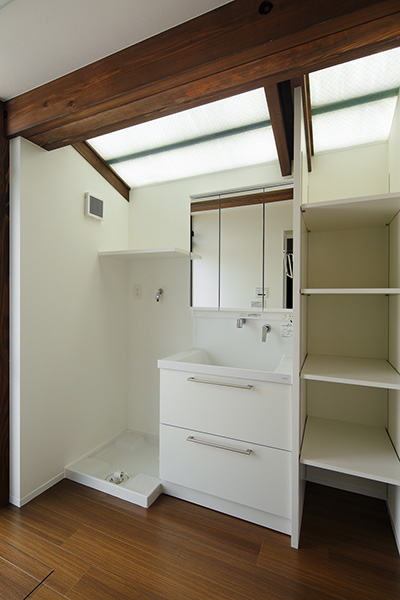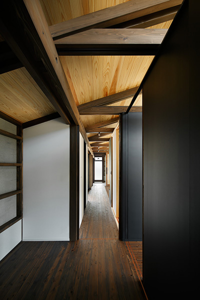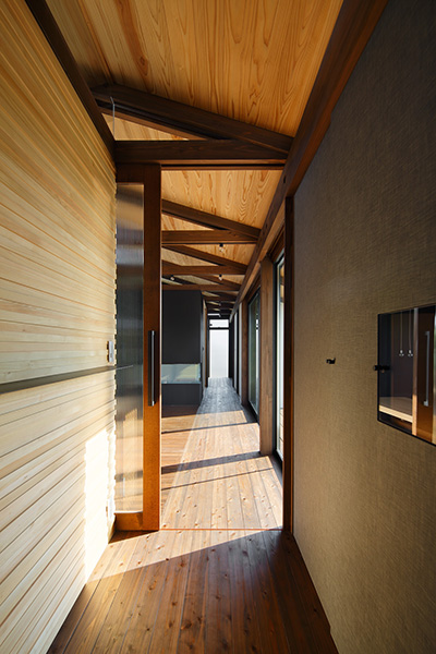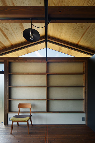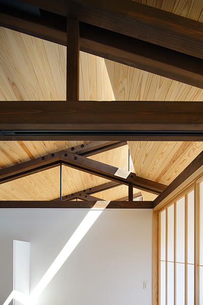その配置や形状をこの住宅でも踏襲することで、朝夕の光を深い軒下の開口部やハイサイド窓で取込み、南中時の強い光は屋根で遮る。