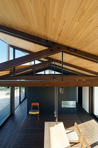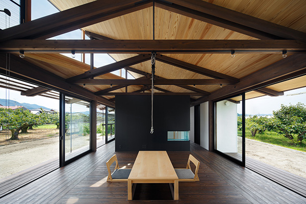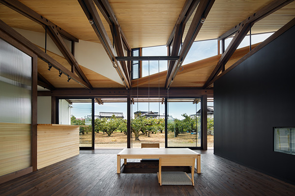 まわりの低く剪定された柿の木を切り取るように設定した低い軒を作る屋根架構は、枝のような細い部材を組み合わせ、ビニルハウスのようにシンプルな接合部をもつトラス構造としている。