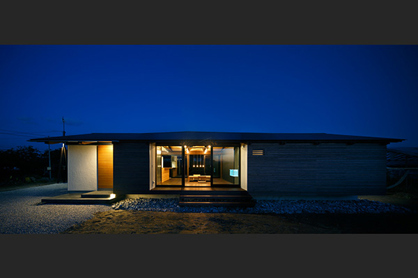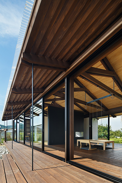 敷地周辺を見回すと、広い空を切り取る低くなだらかな山の稜線、その下に無数に連なる切妻型のビニルハウス、低く腕を伸ばすように剪定された柿の木、などすべてが横へ横へと広がっていくような大らかさを感じる。