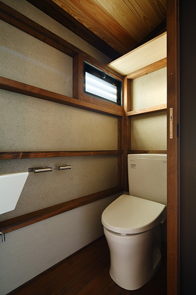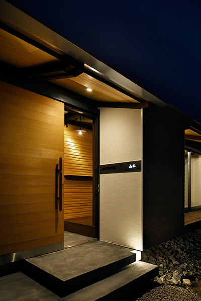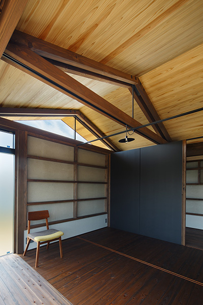 土台は、鉄筋コンクリート製の基礎から半間跳ね出し、切妻型のボリュームが地上に浮いているような軽やかさを表現している。