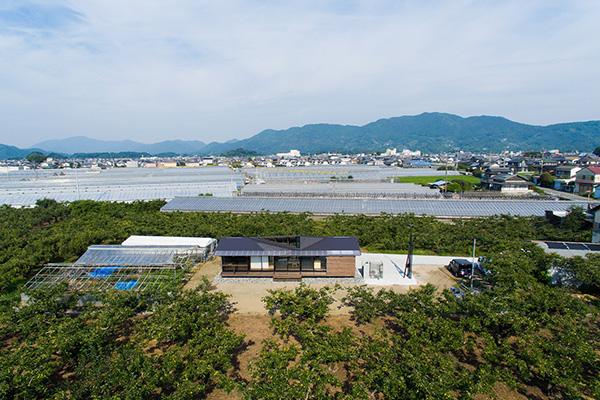 敷地はビニルハウスの立ち並ぶ農業地域、100年以上の歴史ある柿畑に囲まれた場所にある。