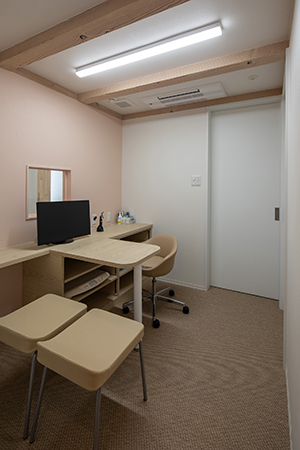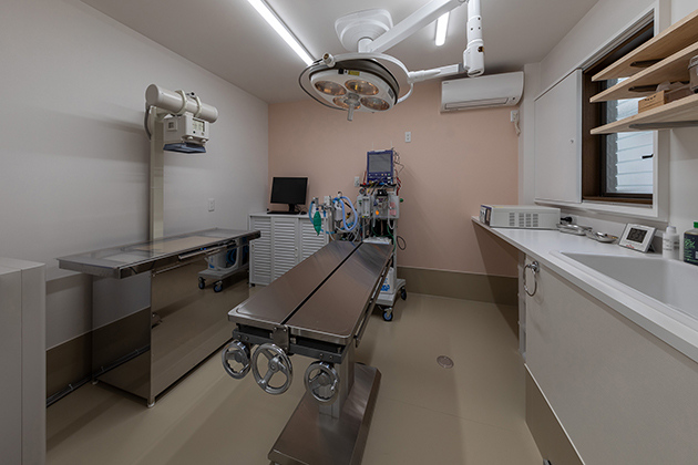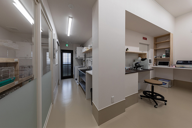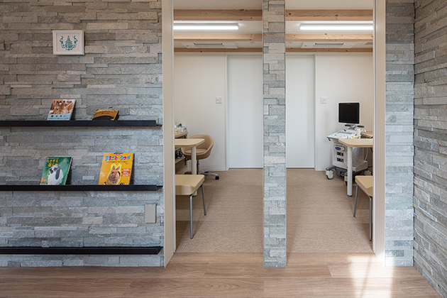 一人の獣医師で効率よく診察をおこなうため、二つある診察室は引き戸で自由に行き来できるようになっており、床はウサギの歩行確認もしやすい滑りにくい織物調ビニルシートを採用している。