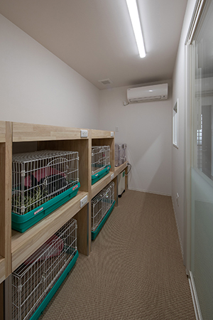 入院室のケージ棚はウサギ用ケージにあわせ製作し、床は診察室と同じ織物調ビニルシートとすることで、お預かりしているウサギをケージの外に出して自由に動きまわってもらえるようにしている。