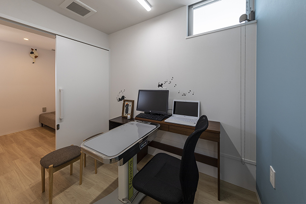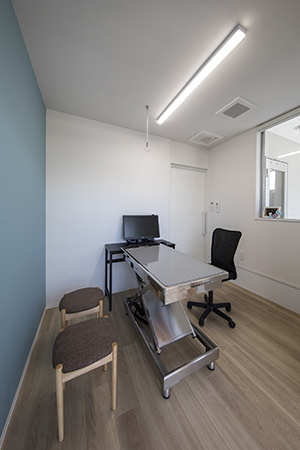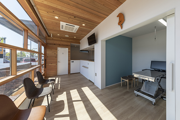 飼い主様へのセミナーやパピー教室を開催することが多いという特徴から、扉を全開にすることで待合室と一体的に使える診察室や、待合室や犬舎と繋がるドックランを計画している。