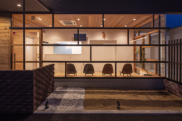 具体的には、駐車場に延びる壁や待合い室の上部にかかる壁など何枚かの壁が交差するように建物を構成している。